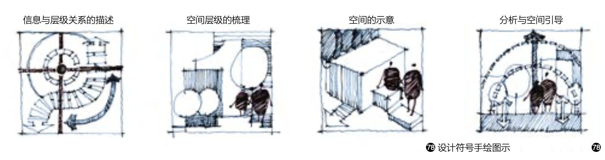 符号是设计示意表达的方式,具有研究性质的设计构想都是从示意图入手的。从设计示意的发展来看我们可以将设计示意图分成四个阶段:构成关系的符号示意;设计构想示意;一般性示意;具体图像。