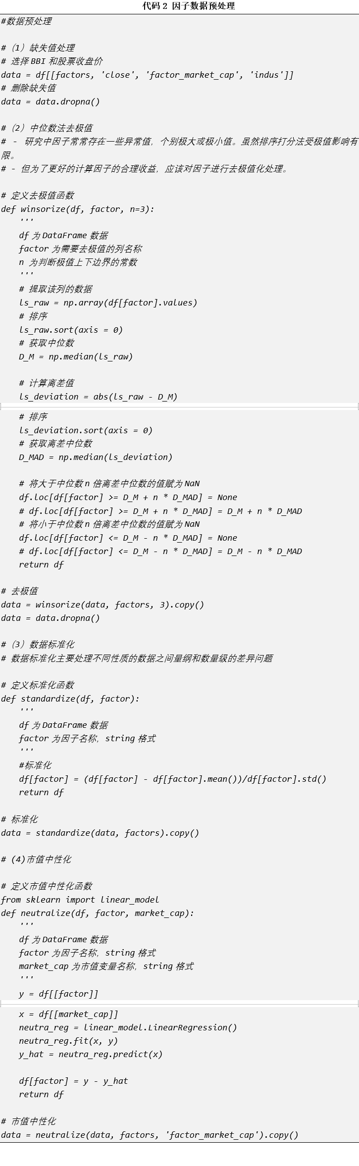 3.对因子数据进行预处理,包括缺失值处理、去极值处理、数据标准化和数据中性化处理