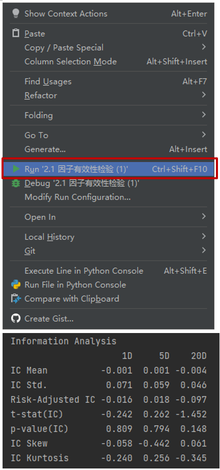 5.右键运行因子有效性检验代码并获取因子有效性检验的信息系数分析结果(Information Analysis)