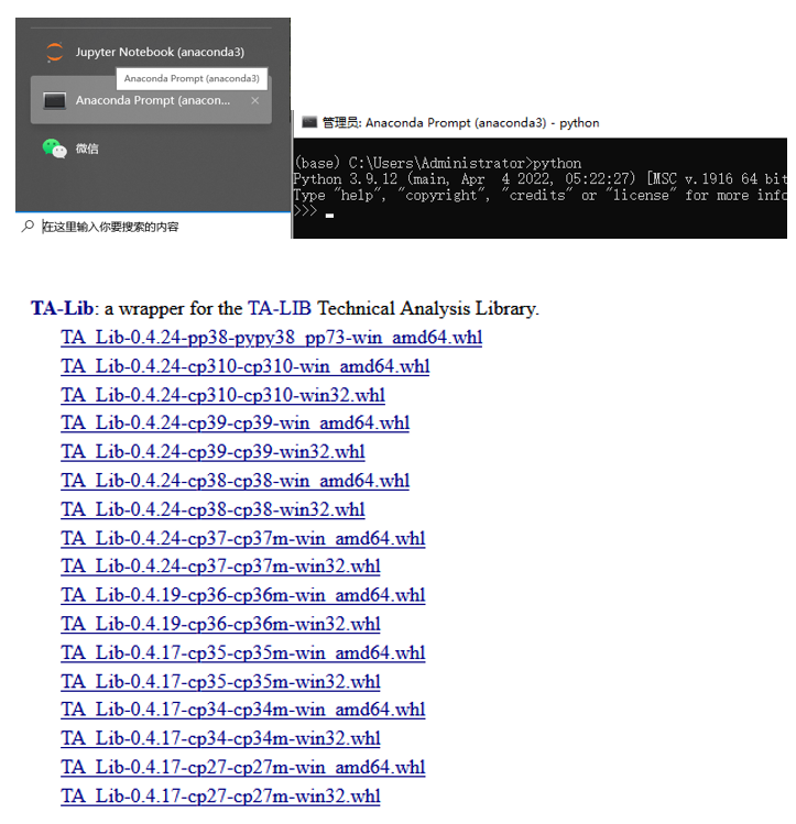 快捷键(ctrl+f)查找安装包TA-LIB,并根据自己的python版本和windows系统下载对应的TA-lib版本。cp310:python版本是3.10;win32指的是32位windows系统;win_amd64指的是系统是64为windows系统。