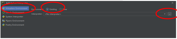 (3)选择Virtuallenv Enviroment和Existing,并点击右边省略号