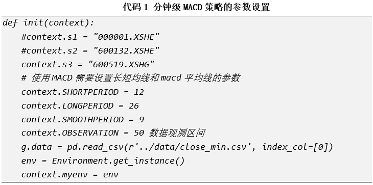 在MACD-MIN.py中,可在def init(context)函数中设定要交易的股票和分钟级MACD的周期参数,主要包括,长短期均线和MACD平均线的参数,代码如下所示: