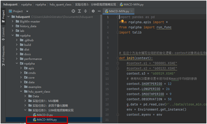 1.在pycharm的hduqant项目中,依次点击hduquant、rqalpha、rqalpha、hdu_quant_class和实验任务3:分钟级高频策略实现,双击MACD-MIN.py