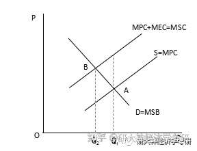 如图所示,不加干预的该产品市场的均衡在A点实现,此时MPC=MSB,所决定的产量水平Q1并不满足MSC=MSB,不是社会资源配置最佳,意味着有效的均衡应当在B点实现,此时MSC=MPC+MEC=MSB,对应的产量水平为Q2。由于Q1>Q2,在存在负的外部效应时,一种物品或服务的生产和销售会呈现过多的状态。