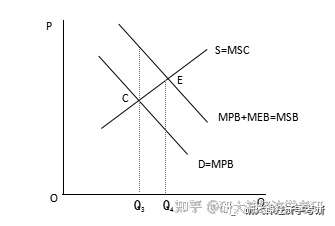 如图所示,需求曲线D仅反映消费者自身的边际效益,与供给线相交于均衡点C,此时MPB=MSC,所决定的产量水平Q3不满足MSC=MSB,不是社会资源配置最佳,意味着有效的均衡应当在E点实现,此时MSC=MPB+MEB=MSB,对应的产量水平为Q4。由于Q3<Q4,在存在正的外部效应时,一种物品或服务的生产和销售会呈现不足的状态。