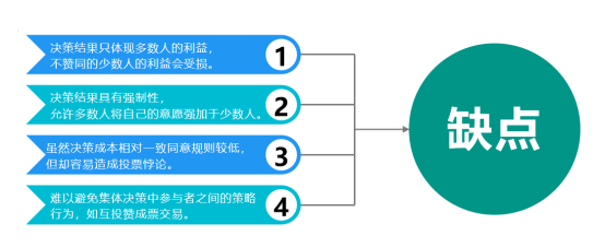 一致同意规则实行的是一票否决制,每一个投票人都拥有对决策或方案的否决权,如果一项决策使其中的任何一个人的利益受到损害,它便不能获得通过。