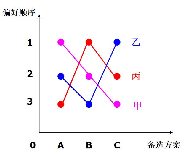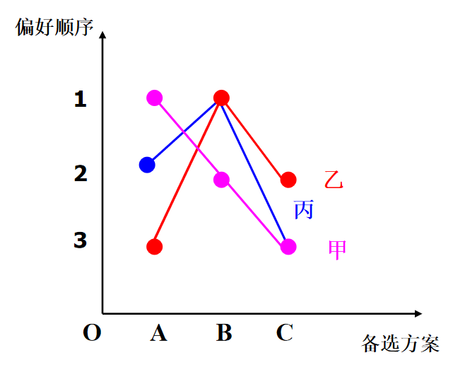 假如甲、乙、丙对A、B、C三个方案的偏好次序为