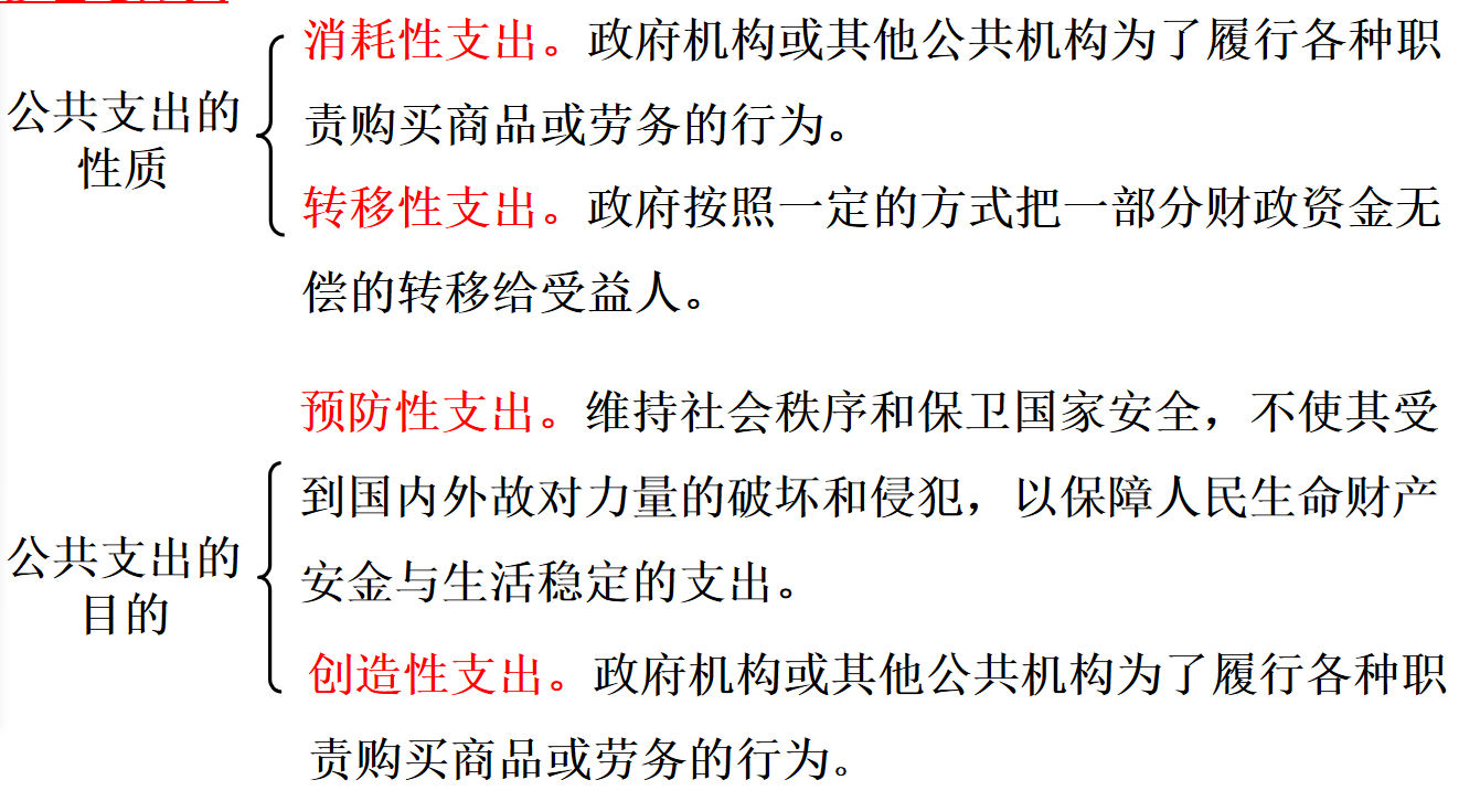 由以上学习可知,公共支出作为政府配置资源、满足社会需要的一种途径和方式,其结构是否合理,将直接影响公共支出本身的效率和结果,进而影响到国民经济发展和人民福利等重大问题。
