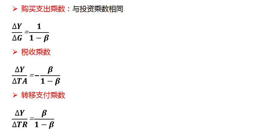 (3)政府转移支付乘数:指国民收入变动对政府转移支付变动的比率。