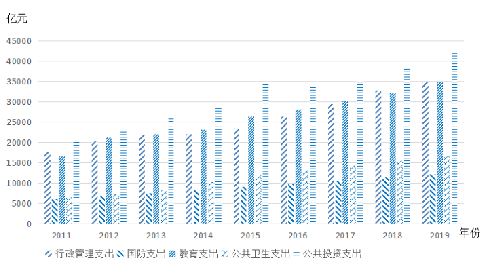 国防支出是否合理,从经济学角度来看,同样需要进行成本-效益分析。国防支出的规模只是问题的一个方面,支出是否达到目标的要求同样是非常重要的。国防支出中所购买的飞机、导弹、航空母舰等军备,显然不是越便宜越好。决策中必须综合考虑这些因素。中国2011-2019年的国防支出规模(如上图图1所示,从图中可以看出,我国国防支出2011年为6027.91亿元,到2019年上升到12122.1亿元,绝对规模呈现上升趋势)。