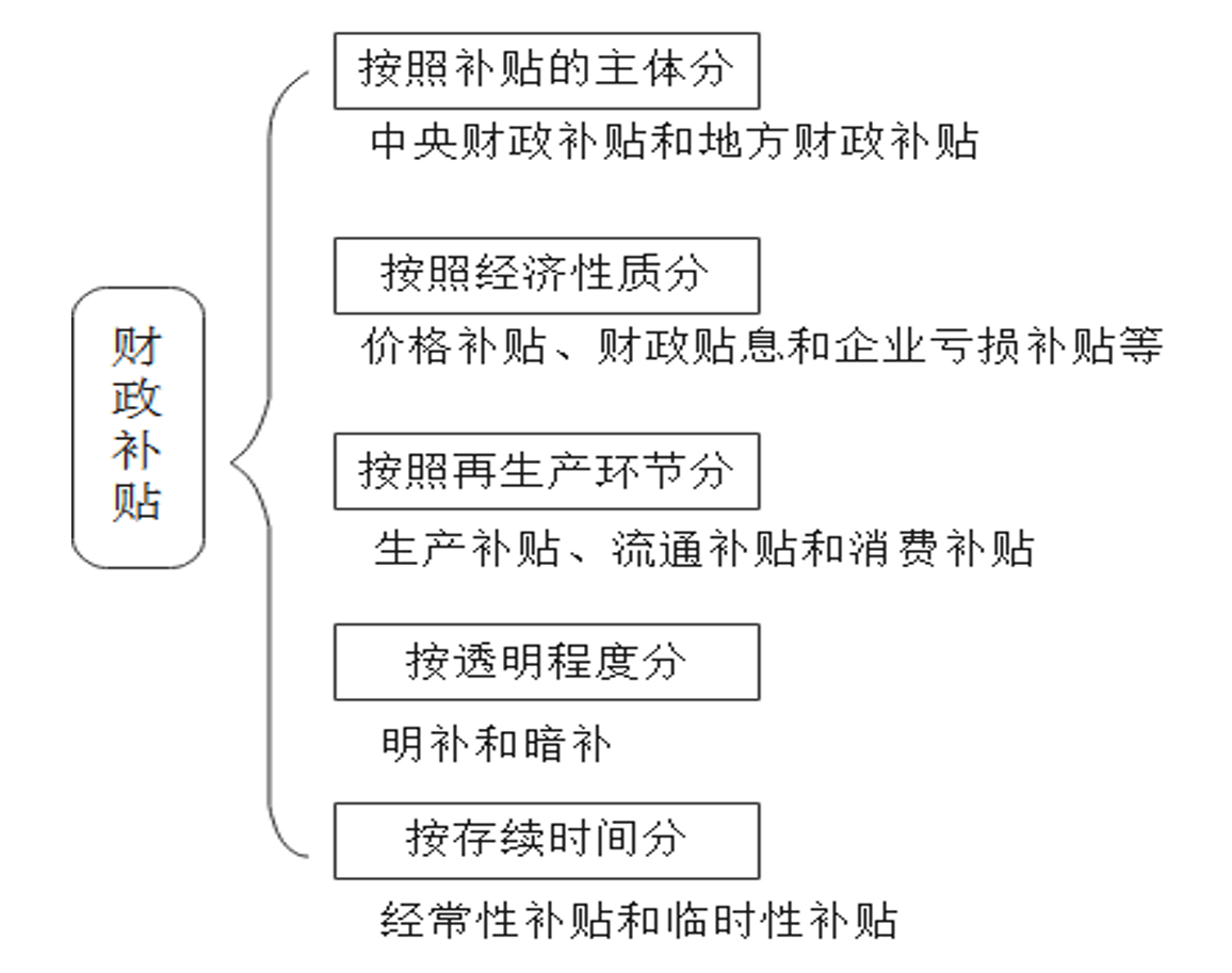 财政补贴含义:一国政府根据一定时期政治经济形势及制定的方针政策,为了有计划地调节社会供求和社会经济生活,通过资金再分配给予生产者、经营者和消费者的一种财政性特定补助,主要是在一定时期内对生产或经营某些销售价格低于成本的企业或因提高商品销售价格而给予企业和消费者的经济补偿。