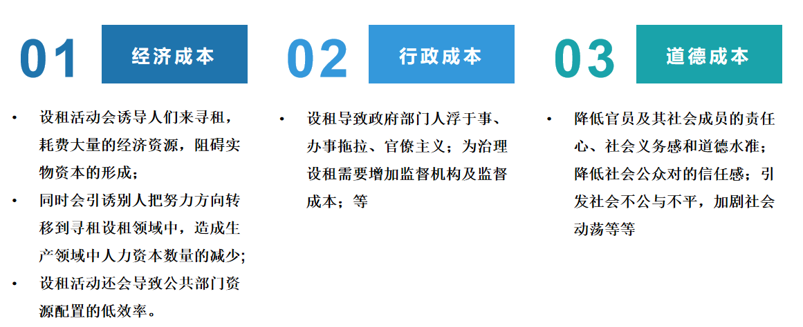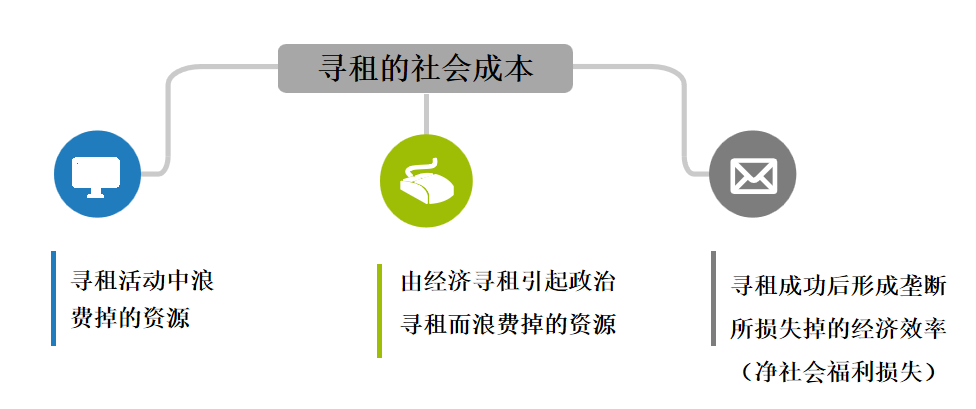 直接成本:搜集潜在经济租信息的成本、游说有关人员的成本、贿赂有关人员的成本、维持垄断地位的成本等。