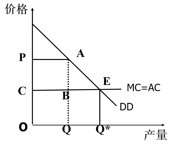 如图,设企业的长期平均成本不变,以CE表示,DD为需求曲线,完全竞争下的产量为Q,如果是垄断者,则价格上升,产出仅为Q*,这时,梯形PAEC的大小表示消费者剩余减少量,其中ABCP的大小表示企业的垄断利润,三角形ABE(哈勃格三角)的大小即垄断的社会福利净损失,即福利成本