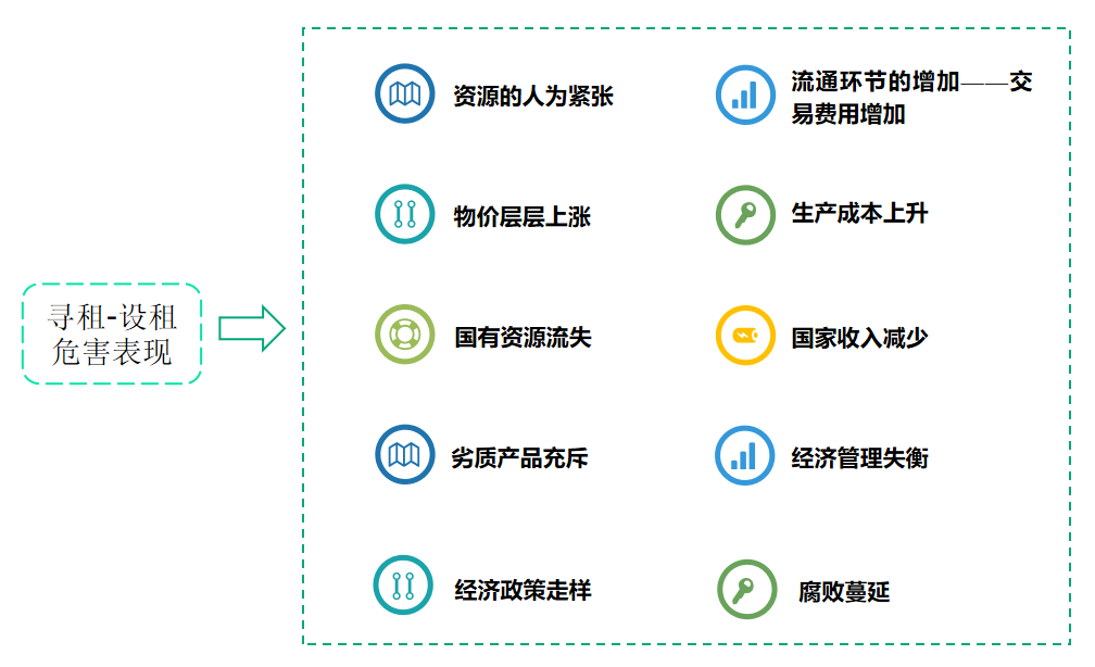非生产性的租金。即谋求政府特权和优惠所形成的垄断租,以及由这种特权所派生的权钱交易、透漏税金、走私放私等。这类活动没有生产出产品,也没有给社会增加福利,相反还消耗了社会资源,导致经济效率下降和社会分配不公。