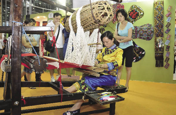 A Zhuang girl demonstrates brocade weaving on a traditional “pig cage” loom at the 5th China (Shenzhen) International Cultural Industries Fair.