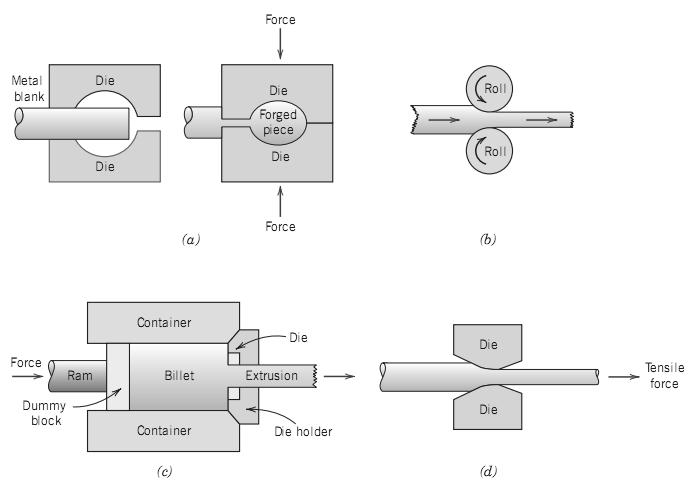 FIGURE.1-1 Some plastic forming operations: (a)forging; (b) rolling; (c) extrusion; (d) drawing.