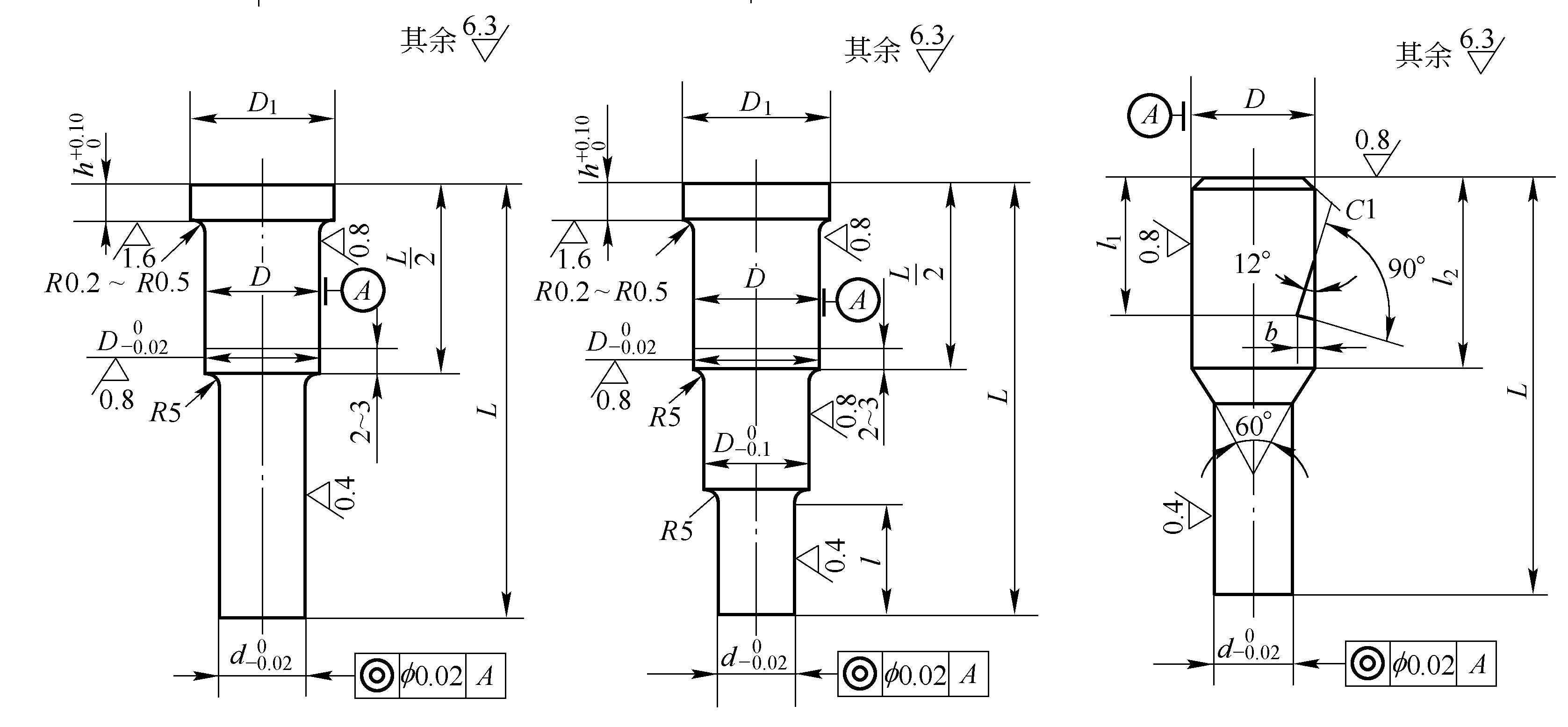 There are three kinds of standard punches with circular form in theNational Standard, as shown in Fig.3-11. Which kind of punch should be selectedis determined by the dimension d in the working portion. The length L of punchshould be determined by the die structure. When using the fixedstripper and stock guide, the length L of punch is: