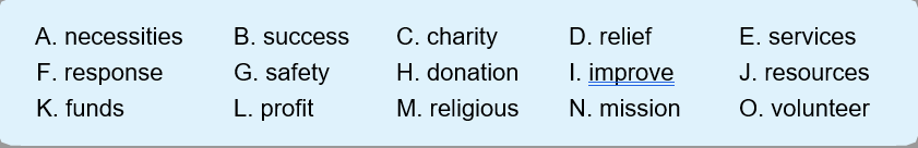 The purpose of a nonprofit organization depends on its goal. Some nonprofits serve to provide aid to people without access to various 6. necessities. An example of such nonprofits is a women's shelter, where women and children are given relief and shelter when seeking7. safety from abusive home situations. Other nonprofits are directed to share a particular 8.religious belief and work to do good in the name of that belief. Such organizations include those that provide charitable 9. services to their communities to meet the needs of people. Education nonprofits aim to 10.improve the conditions of those around them through advancements in education.