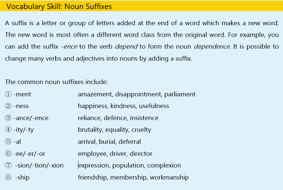 Learn noun suffixes. Use the noun form of the boldfaced verb or adjective in the