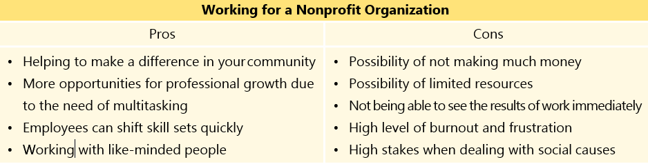 Discussthe question: What are the pros and cons of working for a nonprofit organization? Write your supporting ideas in the chart. Use the words or phrases in the passage when discussing in your group.