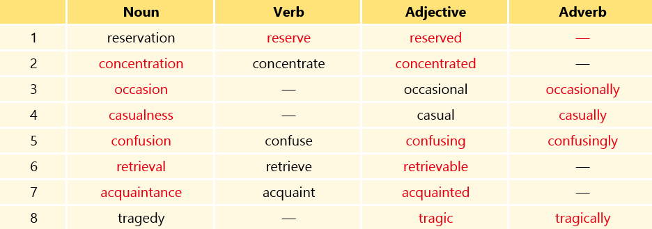 Look back over the passage, or consult your dictionary to find the missing word forms in the chart. After completing the chart, for each sentence below, look at the row in the chart with the same number, and choose the correct word form to complete the sentence.