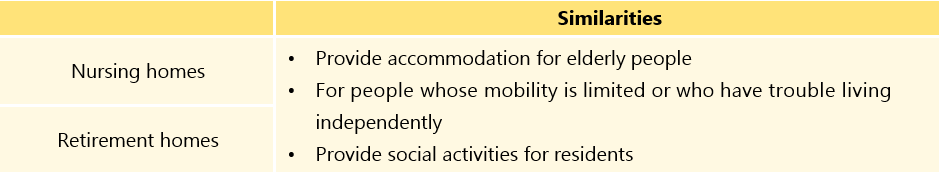 Supporting idea1: Both retirement homes and nursing homes provide accommodation for elderly people.