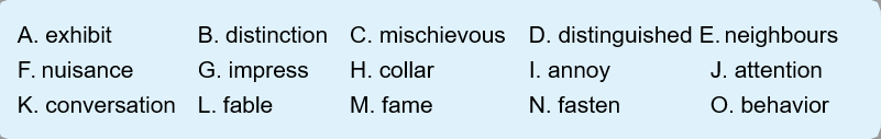 Awell-known 1. fable tells the story of a dog who would sneak up on people and bite at their heels. He was so ill-tempered and 2. mischievous that everyone in the town would complain of his 3. behavior to hismaster. The man grew tired of people's complaints about his dog, so he decided to 4. fasten a large, silver bell around the dog's 5. collar. Now, people would be able to hear him coming and avoid him. Because none of theother dogs in the town had bells around their necks, he believed his bell to be a mark of 6. distinction. The dog proudly walked through the market and rang it noisily, wishing to attract everybody's 7. attention. As he was wondering why he was unable to 8.impress anyone, an older dog approached him and asked, “Why do you 9. exhibit yourself in such a way?The bell you wear is a notice to people to avoid you. Your 10. fame is not something to be proud of.”