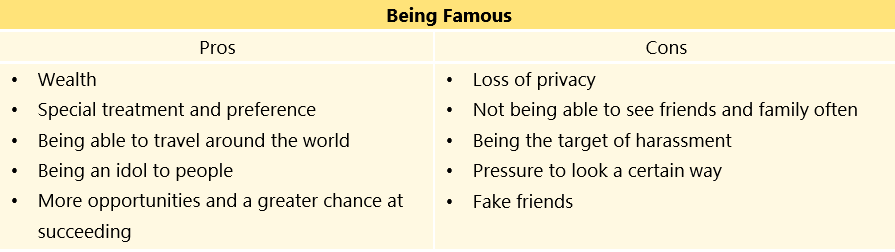 Discuss the question: What are the pros and cons of being famous? Write your supporting ideas in the chart. Use the words or phrases in the passage when discussing in your group.