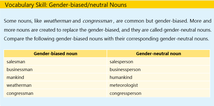 Learn gender-biased and gender-neutral nouns. Complete the sentences below with proper gender-neutral nouns.
