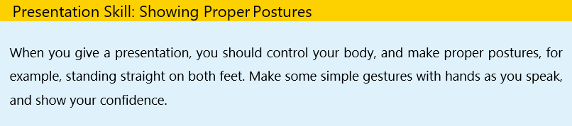 Step 4 Prepare your presentation. Make a rehearsal before you give it to the class. The presentation skill below is for your reference.