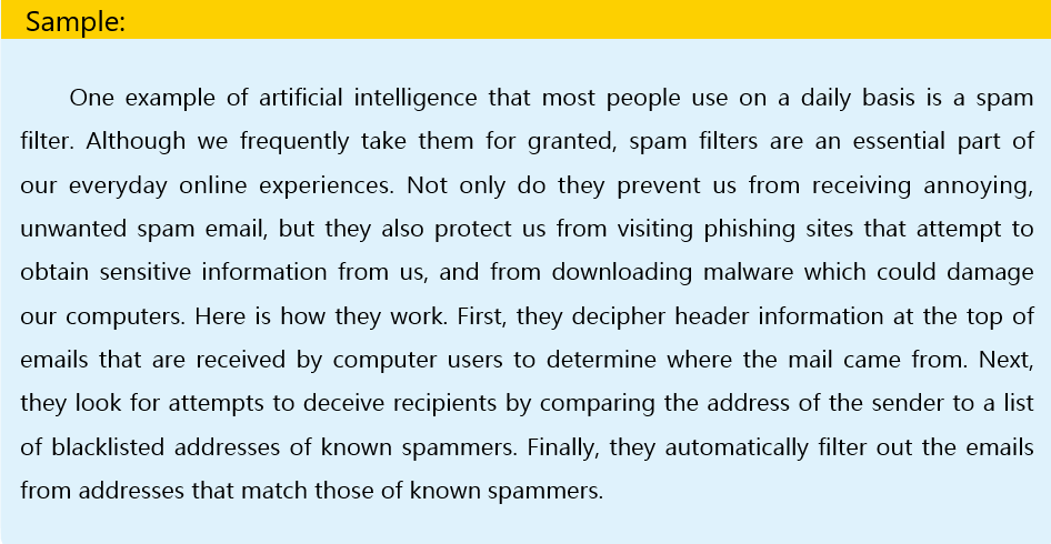 Topic sentence: One example of artificial intelligence that most people use on adaily basis is a spam filter.