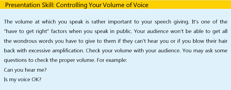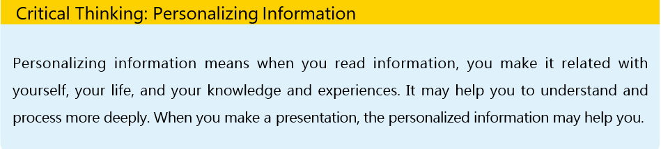 Step 4 Prepare your presentation. Make a rehearsal before you give it to the class. The presentation skill below is for your reference.