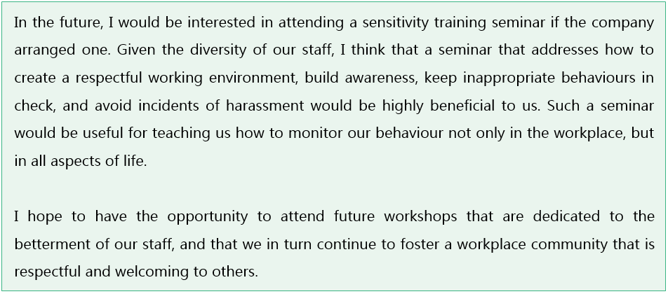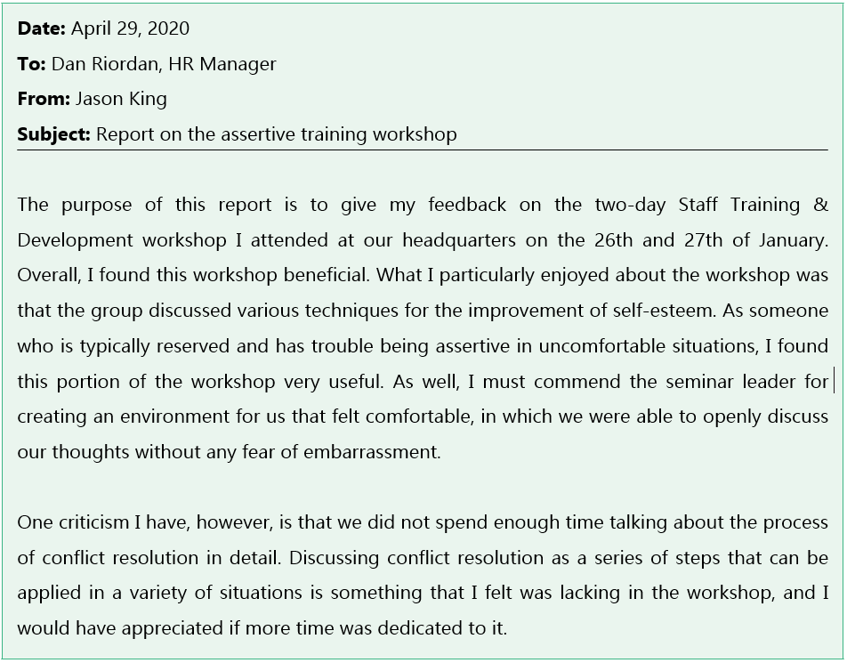 You recently attended an assertive training workshop organized by the department. The head of HR has asked you to write a short report (about 200 words) about the training.