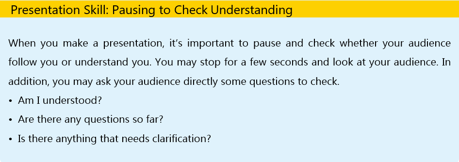 Step 4 Prepare your presentation. Make a rehearsal before you give it to the class. The presentation skill below is for your reference.