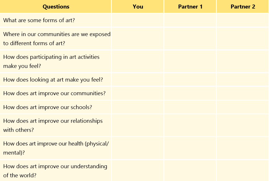 Consider what you have learned in this unit, and then develop a presentation about the societal benefits of the arts. How does art better us as people, and as a community? Please follow the steps and then give your presentation to the class.