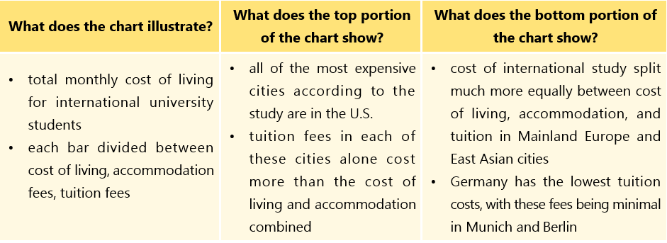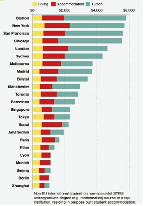 Each bar is split between cost of living, cost of accommodation, and cost of tuition