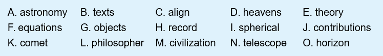 The ancient Greeks are popularly known as the fathers of ancient space study, as they formulated theories and mathematical 6. equations in an attempt to explain the universe. One of the most well-known of these pioneers was Pythagoras, a mathematician who postulated that the earth is 7. spherical inshape as other celestial bodies are. He came up with this idea when he saw ships disappear past the 8. horizon as they sail.