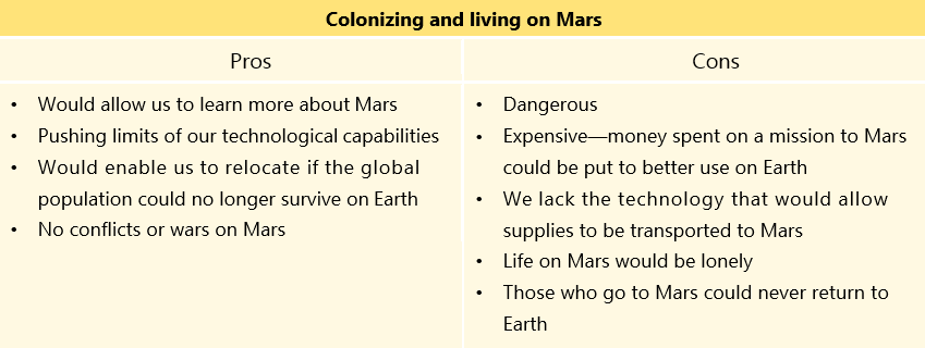Discuss the question: What are the pros and cons of colonizing and living on Mars? Write your supporting ideas in the chart. Use the words or phrases in the passage when discussing in your group.