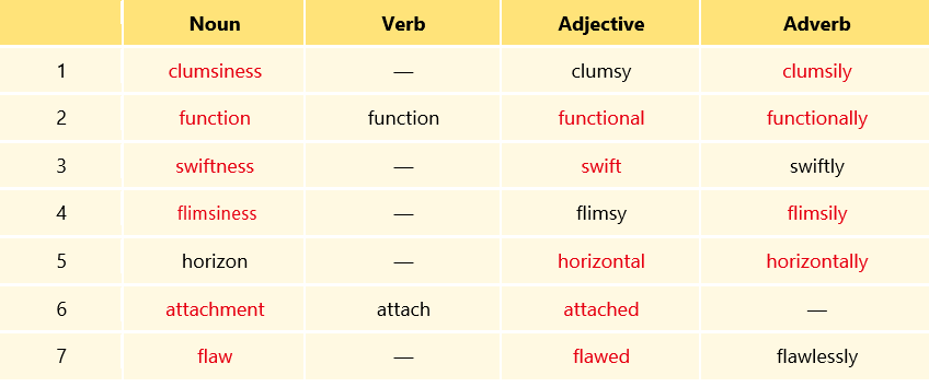 Look back over the passage, or consult your dictionary to find the missing word forms in the chart. After completing the chart, for each sentence below, look at the row in the chart with the same number, and choose the correct word form to complete the sentence.