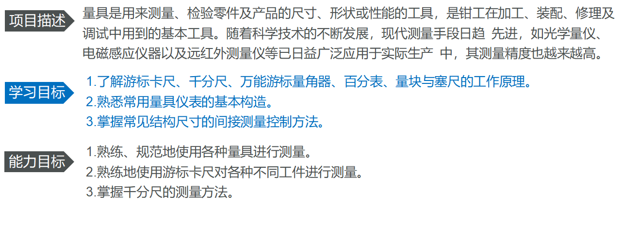 思政目标:各种量具是保证零件加工精度的关键。需要学生不断地练习并总结经验,需要培养学生吃苦耐劳的劳模精神和精益求精的工匠精神。