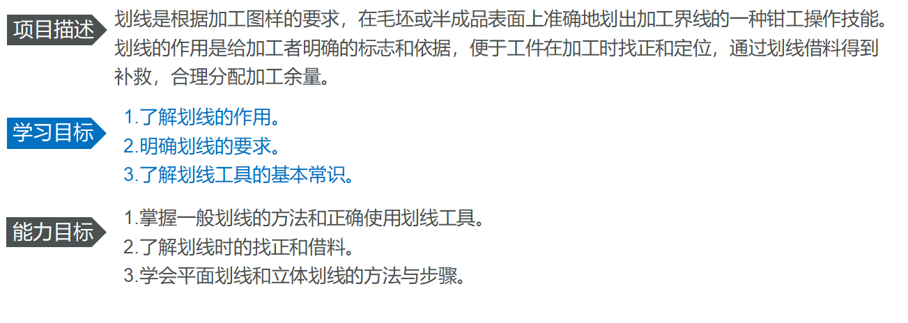 思政目标:划线是保证加工效率和加工精度的关键。需要学生不断地练习并总结经验,需要培养学生吃苦耐劳的劳模精神和精益求精的工匠精神。