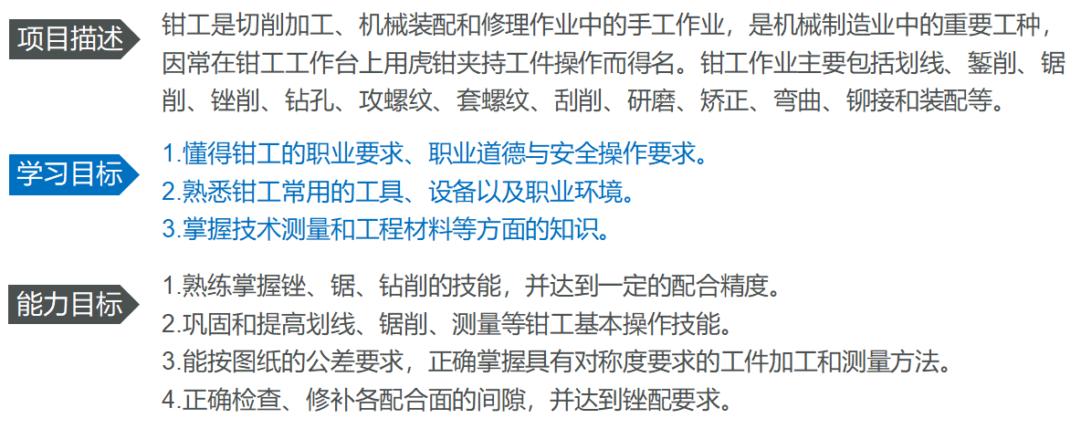 思政目标:钳工是以手工操作为主,灵活性很强,加工质量与操作人员关系很大。需要学生不断地练习并总结经验,要培养学生吃苦耐劳的劳模精神和精益求精的工匠精神。