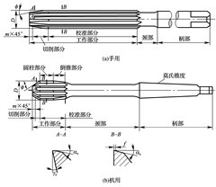 手用铰刀切削速度低,全靠校准部分导向,所以校准部分较长,整个校准部分都做成倒锥,而不做成圆柱,倒锥量较小(0.005~0.008 mm)。