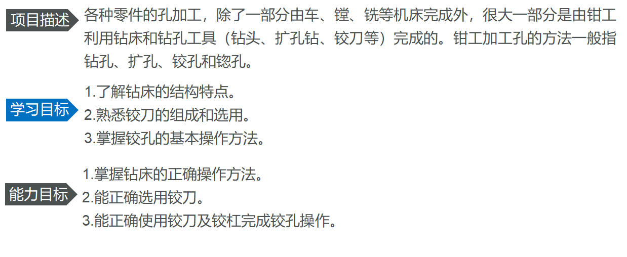 学习方法:教学视频学习、微课学习、章节自测、铰孔实践训练。