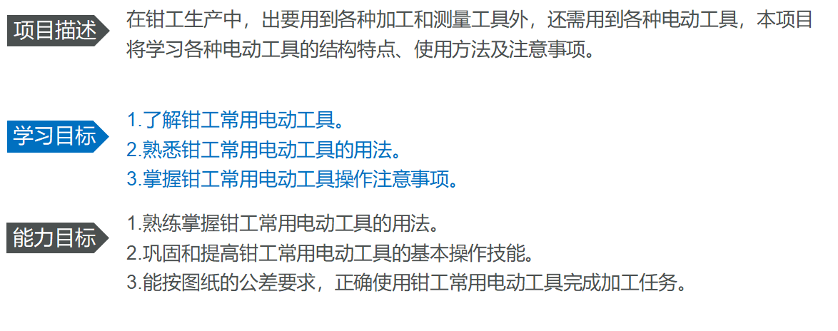 学习难点:熟练使用钳工实训间现有的电动工具及气动工具。