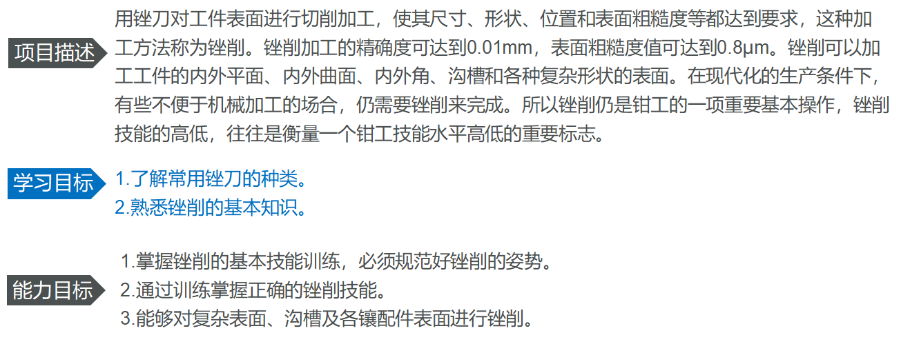 学习方法:教学视频学习、微课学习、章节自测、锉削实践训练。