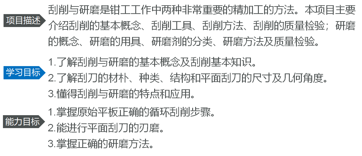 学习难点: 1. 了解刮削的基本原理、刮削用到的工具和检具;