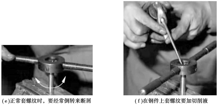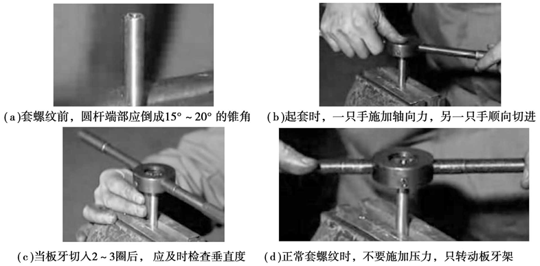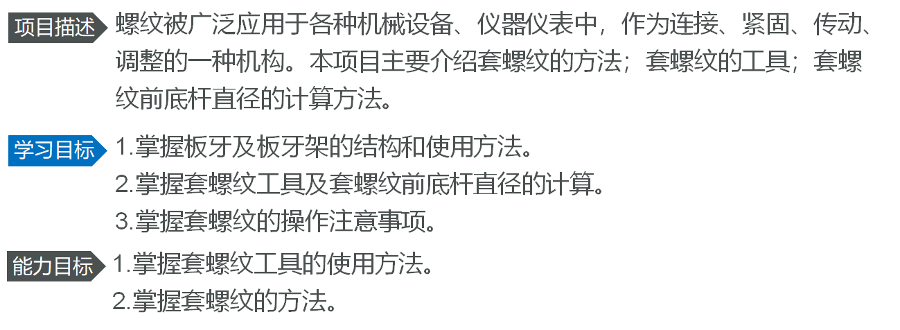 思政目标:套螺纹的灵活性很强,加工质量与操作者技能有很大关系,需要学生不断地练习并总结经验。培养学生吃苦耐劳的劳模精神和精益求精的工匠精神。