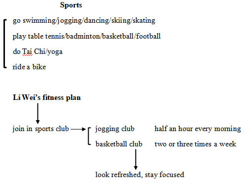 8. Ss listen to the dialogue and take down notes by using key words or marks. Ss find out the reason why Li Wei has such a big change and What Li Wei did to keep fit.