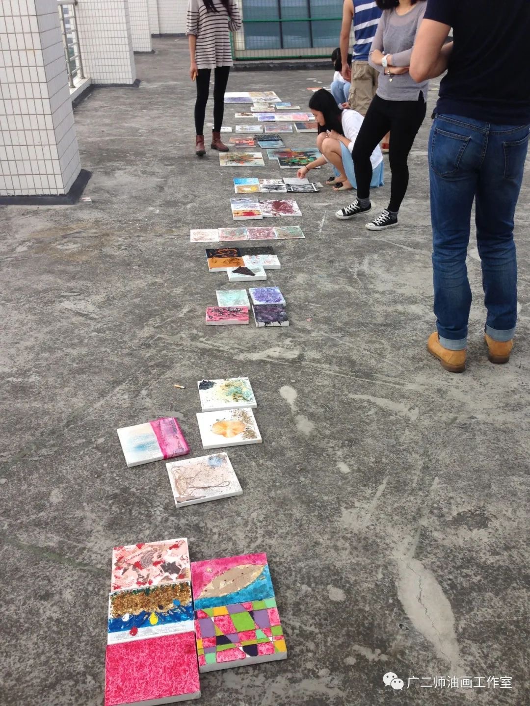 下图为综合材料技法应用课程江华老师的教学过程图片,师生展开艺术讨论。